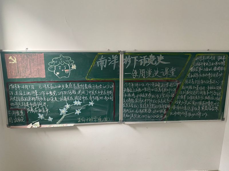 每周出版一期党史板报。学生党员志愿成立党史宣讲团,在宿舍区开辟“南洋杉下学党史”主题板报,追溯红色党史、挖掘红色故事、体悟红色文化,严格落实三审三校制度,确保板报内容准确鲜明、生动活泼,教育引领广大青年学生学党史、知党情、跟党走,做到学史明理、学史增信、学史崇德、学史力行。