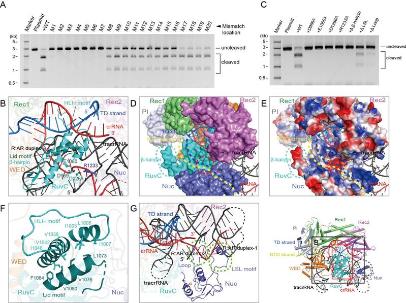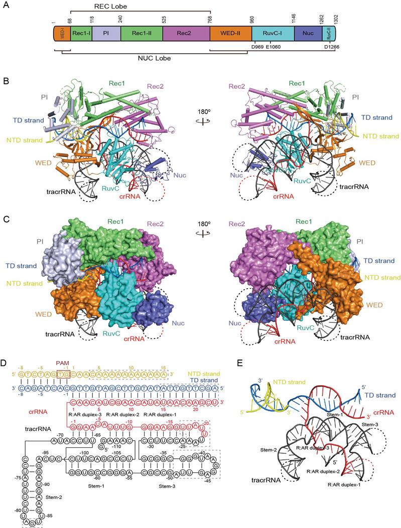 图1. Cas12c1-sgRNA-target DNA三元复合物的晶体结构