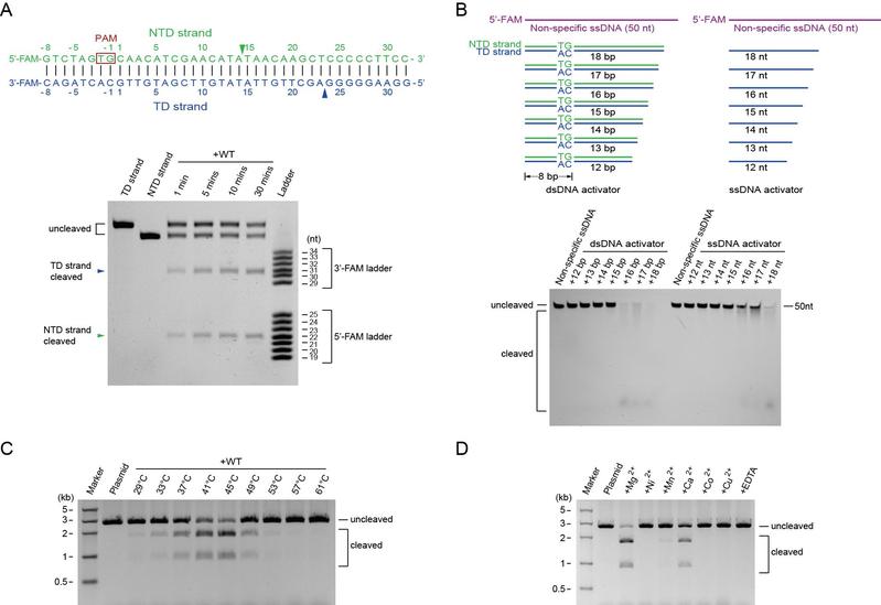 图4. 靶DNA双链的顺式切割及激活Cas12c1的DNA酶切活性的靶DNA长度