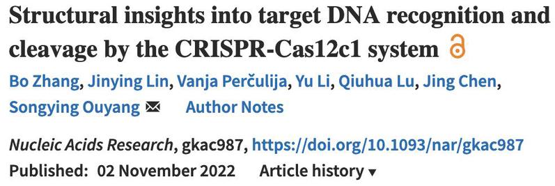 2022年11月2日,《Nucleic Acids Research》杂志在线发表了福建师范大学欧阳松应教授课题组关于CRISPR-Cas系统第二大类效应蛋白Cas12c1的最新研究成果,论文标题为“Structural insights into target DNA recognition and cleavage by the CRISPR-Cas12c1 system”。该研究报道了Cas12c1效应蛋白与sgRNA(通过融合crRNA与tracrRNA获得)及含有5′-TG-3′PAM的双链靶DNA形成的三元复合物的晶体结构;通过结构分析与生化实验,揭示了Cas12c1识别sgRNA、PAM序列的结构基础,以及Cas12c1通过关键氨基酸残基与蛋白基序参与双链靶DNA的识别、解旋及切割的分子机理;该研究结果为基因编辑工作中有效使用CRISPR-Cas12c1系统提供了理论指导。这是该课题组继CRISPR-Cas12i1(详见BioArt报道:Nat Comm | 欧阳松应组发表CRISPR-Cas12i效应蛋白结构与功能最新研究成果)、CRISPR-Cas13b(详见BioArt报道:Cell Research | 欧阳松应组在CRISPR-Cas13b结构与功能方面取得重要进展)、CRISPR-Cas13d(详见BioArt报道:Nat Comm | 欧阳松应课题组发表CRISPR-Cas13d最新研究成果)的结构与功能研究之后的又一研究成果。此外,该课题组还报道了相关综述(详见BioArt报道:Adv Sci综述 | 欧阳松应团队总结细菌CRISPR-Cas13系统效应蛋白结构与功能机制、应用及研究前景)。