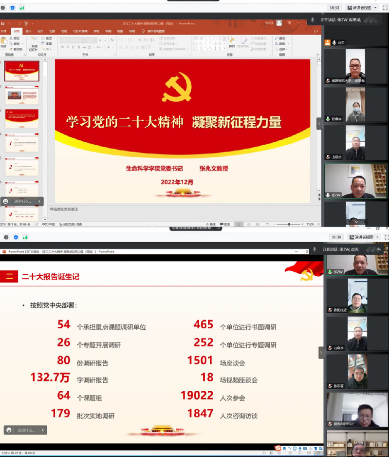 学习会上,张兆文同志以《学习党的二十大精神,凝聚新征程力量》为题,围绕二十大报告的诞生、新时代十年伟大变革的里程碑意义、以教育科技人才支撑强国建设、党章修订的要点内容等方面作重点发言。他指出,高校作为教育、科技、人才结合最为紧密的联合体,院系作为具体任务的承担者,要不断增强政治功能和组织功能,积极把院系党组织和党支部建成坚强战斗堡垒,将党的组织优势转化为推动高校“双一流”建设的强大动力,为高等教育高质量发展注入强大动能,为全面建成社会主义现代化强国提供基础性、战略性支撑。