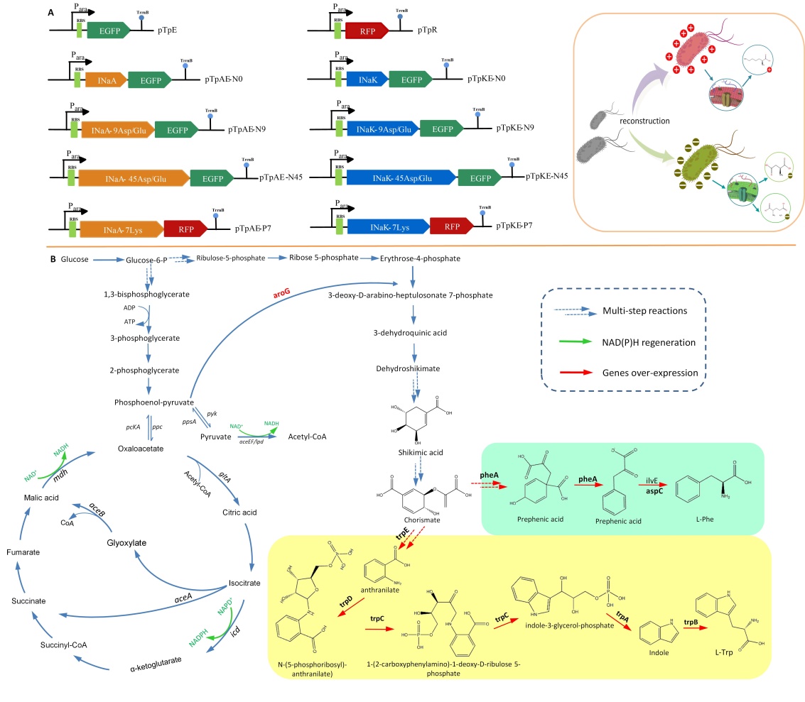 这项研究是在本课题组前期研究(ACS Synthetic Biology. 2022, 11, 8, 2889–2900;Journal of Agricultural & Food Chemistry. 2021, 69, 1916−1924)的基础上进行的。生物炭(Biochar)是一种多孔且碳稳定的材料,由于其低成本和丰富的独特微孔结构,具有潜在的高吸附能力。目前生物炭已经用在固定化细胞研究方面,然而由于物理吸附之间的稳定力强度低,在工程技术领域吸附并不具有高固定效率。本研究中我们首次尝试强化生物炭和重组大肠杆菌细胞之间的静电作用(Electrostatic interaction)来增强它们之间的吸附作用,即使用截短的冰核蛋白(INPs)作为锚定基序(Anchoring motifs),在工程大肠杆菌细胞表面显示了一定量的带负电荷的氨基酸。然后利用FeCl3无机盐溶液进行生物炭改性,获得了表面富集正电荷的改性生物炭MBC-Fe,从而强化了过表达Asp-和Glu-的细胞与MBC-Fe之间的吸附作用。将增强吸附的策略应用于先前开发的生产L-色氨酸和L-苯丙氨酸的大肠杆菌菌株。结果表明,带电荷的氨基酸可以通过INaA锚定在细胞表面,融合蛋白成功地为细胞提供了相应的电荷。构建的全细胞生物催化剂Mp-trpAN45@MBC-Fe和Cc-pheAN45@MBC-Fe携带最多的负电荷,可以显著提高目的产物L-Trp和L-Phe的摇瓶分批发酵中的可重复使用性。本研究中开发的新策略可以显著强化固定化细胞的效果,并且在分批发酵中表现出优异的可重复使用性,同时也证明了细胞和载体之间吸附作用的强化是提高全细胞固定化生物催化剂可重复使用性的有效策略。