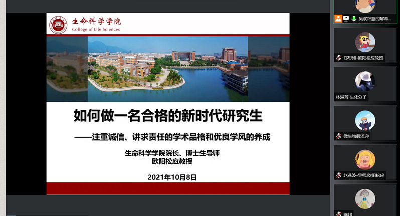 10月8日下午,生命科学学院院长、博士生导师欧阳松应教授以线上会议的形式,为2021级全体硕、博研究生上专题思政课,思政课主题为“如何做一名合格的新时代研究生——注重诚信、讲求责任的学术品格和优良学风的养成”。