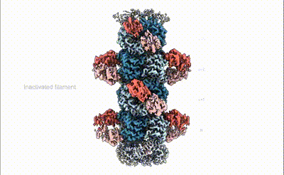 为进一步揭示 dITP 对 KomBC 复合物的激活机制,研究人员利用冷冻电镜技术解析了加入 dITP 后的结构。结果发现,dITP 的加入会显著促进 KomBC 复合物由游离状态向纤维状结构转变(图1),尽管在未加入 dITP 时已有少量复合物呈现纤维状构象,电镜图片显示dITP 明显加速了这一聚集过程。对 dITP 关键结合位点进行点突变后,复合物的 NAD⁺ 水解活性均出现不同程度的下降。结构对比分析显示,dITP 结合后2分子的 KomB 之间形成类似“握手”的构象变化,使其相互作用更加紧密。