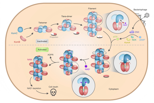 孔明抗噬菌体系统是2025年华中农业大学韩文元教授发现的利用碱基修饰核苷酸作为第二信使的细菌免疫防御系统,孔明系统由KomA、KomB、KomC三个蛋白组成,当噬菌体入侵时,噬菌体来源的脱氧核苷酸激酶(DNK)参与dITP的合成。然而,孔明系统如何识别dITP以及dITP如何激活KomC的NAD水解酶活性一直不清楚。研究人员选取了来源于Archangium gephyra 菌株的孔明抗噬菌体系统,发现KomB 与 KomC 形成的 KomBC 复合物以 4∶4 的方式组装,在 dITP 存在的条件下表现出极强的 NAD⁺ 水解活性。