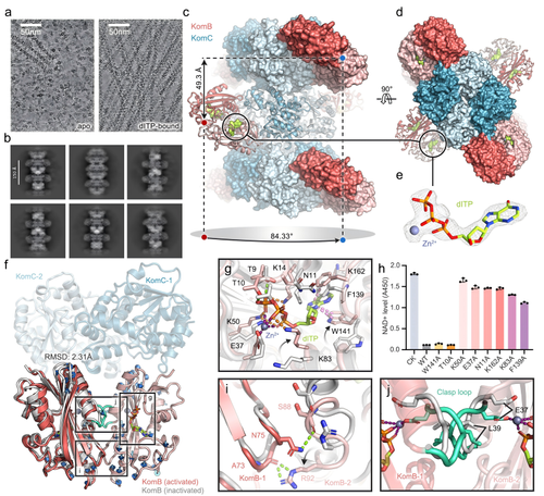 随后,研究人员解析了KomBC与dITP的多个复合物的结构,发现KomB结合dITP后,最终传导到 KomC,使它的NAD⁺ 结合口袋发生收缩,从而显著提高 KomC 对 NAD⁺ 的亲和力。