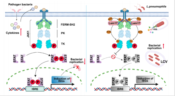 近日,我院欧阳松应教授团队在《Nature Communications》上在线发表题为“A bacterial YopJ-family acetyltransferase suppresses host immune response by Nε-acetylation of JAK1”的论文,揭示了嗜肺军团菌效应蛋白Lem17通过双重机制劫持宿主JAK-STAT信号通路、实现免疫逃逸的新机制。