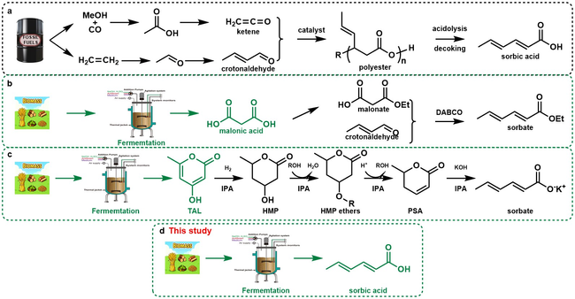山梨酸及其盐类是全球应用最广泛、最安全的食品防腐剂之一,被广泛用于食品、饮料及日化产品中,相关产业规模达数千亿美元。然而,目前山梨酸的工业化生产几乎完全依赖石油基化学合成路线,不仅消耗不可再生资源,而且面临环境负荷高、难以满足“天然来源”和“清洁标签”消费趋势等问题。开发绿色、可持续的山梨酸生物制造技术具有重要的科学意义与产业价值。