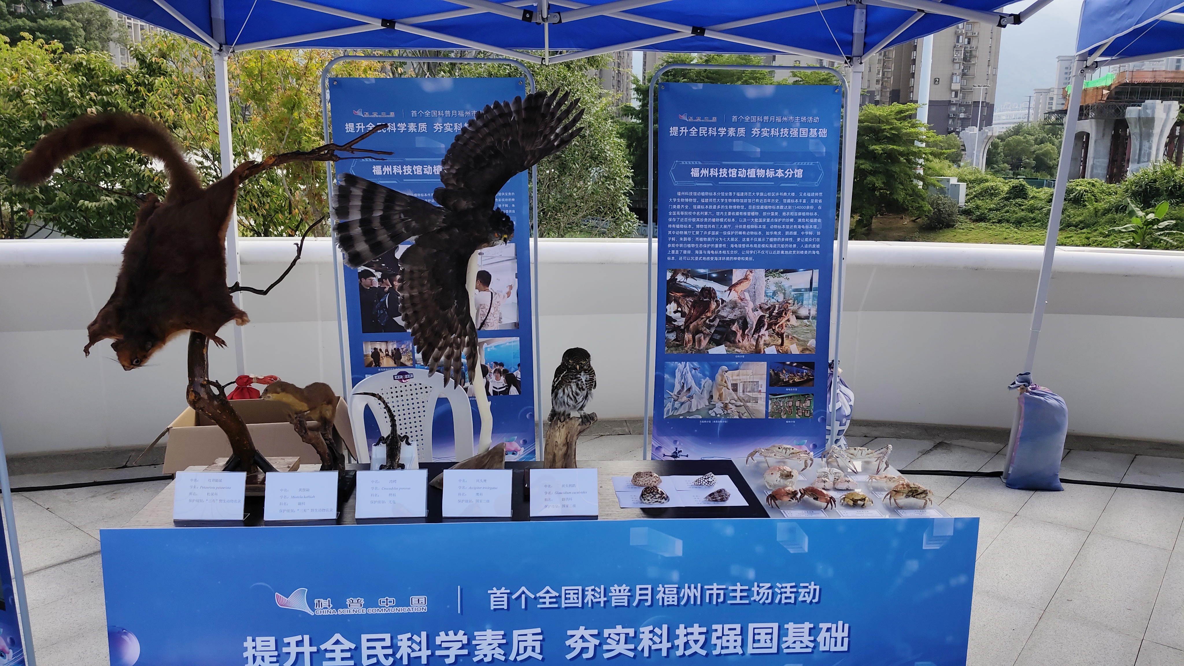 作为福州科技馆动植物标本分馆,本次活动,福建师范大学生物博物馆将携带包括斑头鸺鹠、凤头鹰、湾鳄(幼崽)、大鼯鼠和各类螃蟹、贝壳在内的多份动物标本进行展出,在活动现场设置了一个迷你标本馆,同时由生物博物馆专职教师韦剑辉带领志愿者队伍进行现场讲解。