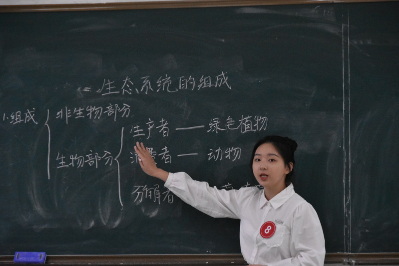 经过初赛选拔,共有12位选手进入决赛。决赛采用省高校师范生教学技能大赛赛制,由选手现场抽取教材内容,按课程标准要求和教学设计规范进行教学设计,并进行模拟课堂教学。在模拟课堂教学中,参赛选手们条理清晰地向现场的评委老师们讲解了他们对教学目标、教学重难点、教学过程的独特看法,充分展示了我校师范生的专业素养和知识储备。其中,来自2019级生物科学(师范)专业的丁琳欣同学充分利用启发式教学的方式,循循善诱,精心设计了8个层次逐渐递进的问题,为大家带来了一场别开生面的课堂教学。